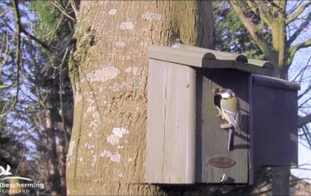 Deze winter was er al een slaper in de kast. Of dat ook degene is die de kast op de dag aan het bewerken is en die later op de dag weer binnenkomt om te slapen is niet met zekerheid te zeggen. Als de ene koolmees binnenkomt om te slapen komt er een tweede even bij de kast gluren. Pech, want die is dus al bezet