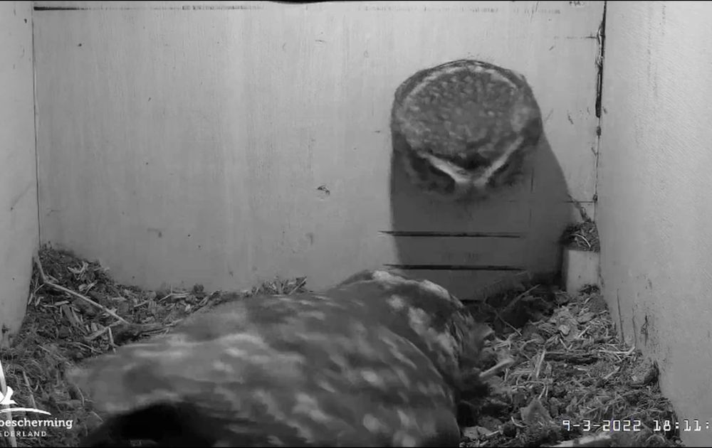 Man en vrouw steenuil komen na een lange middag in de lentezon uitrusten in de nestkast.