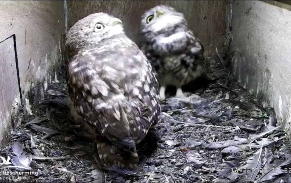 Twee jonge steenuilen komen na een ouderlijk alarm in de nestkast terecht.