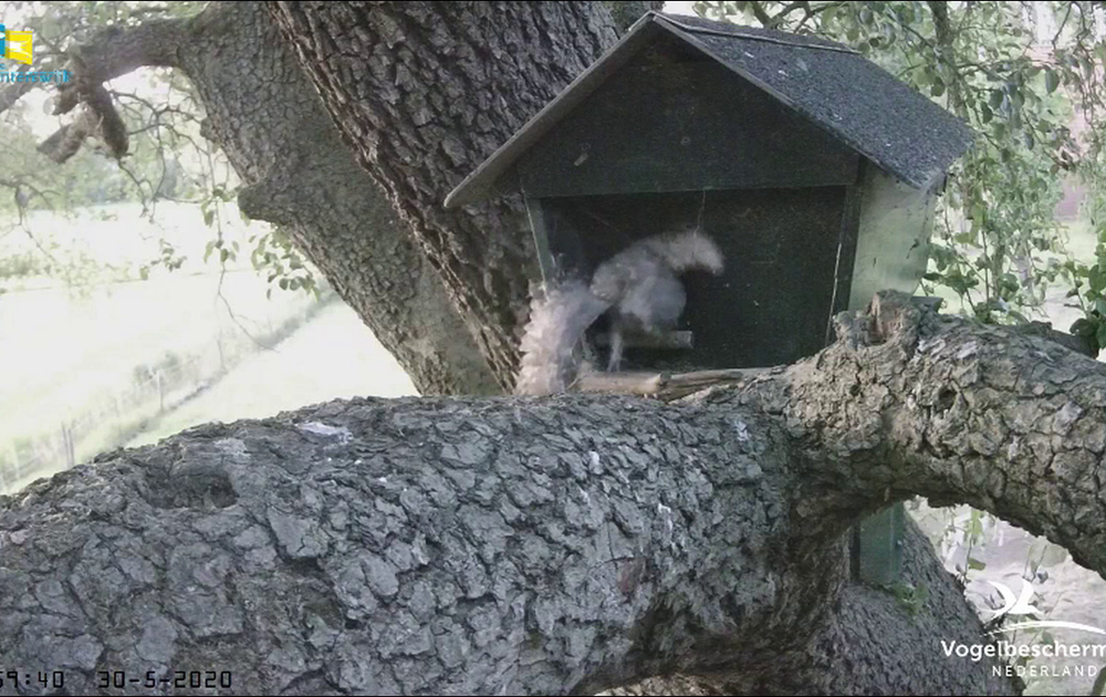 Een kuiken zet een poot buiten de kast. Als vrouw met een prooi komt gaat het kuiken snel naar binnen waarbij twee poten op de drempel terecht komen.