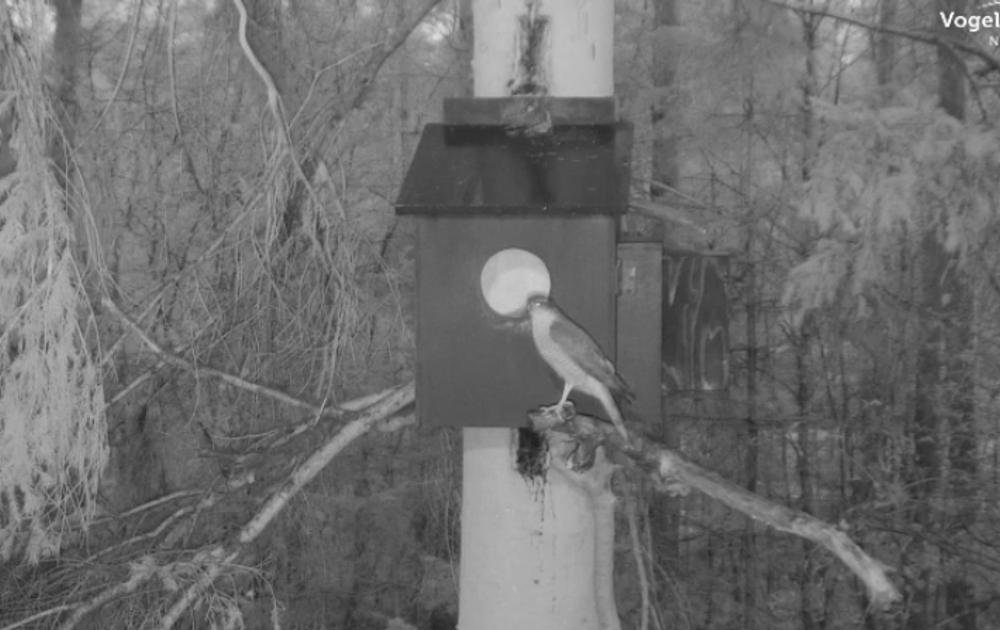 Een sperwer bij de kast. Gevaar? Niet echt, maar als die vaker zou komen zijn de ouders paraat om die weg te jagen