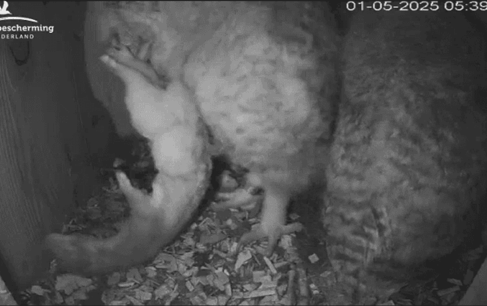 Vannacht bracht vrouw bosuil als een 'Razende Roeland' een prooi naar binnen en begon de kuikens daarvan wat te voederen. Dat ging moeizaam: taaie prooi.