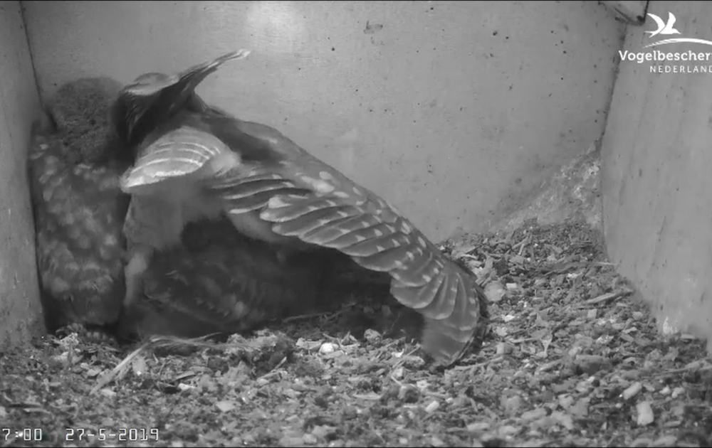 Vrouw steenuil komt de nestkast in om de rommel op te ruimen, dan wil ze weer weg...