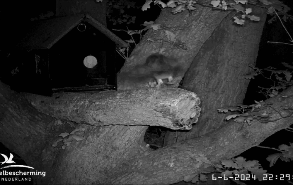 Kuiken RP (RechtsPoot, rechtsgeringd) gaat voor het eerst de tak voor de nestkast op en durft nog niet te vliegen. Geen probleem want de voedseluitgifte is op die tak.