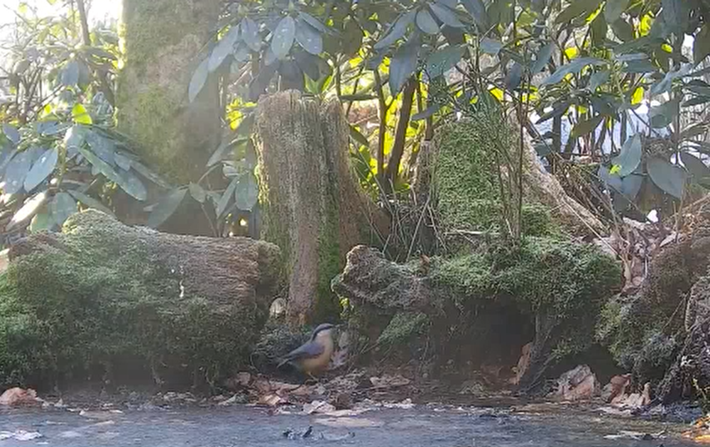 De vijver is ook een uitstekende plaats om nestmateriaal te verzamelen, zoals deze boomklever laat zien.