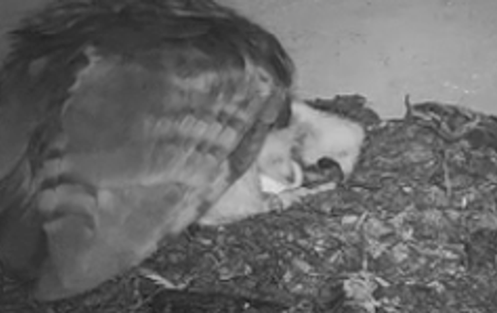 Een van de al wat oudere kuikens, produceert een enorme braakbal.