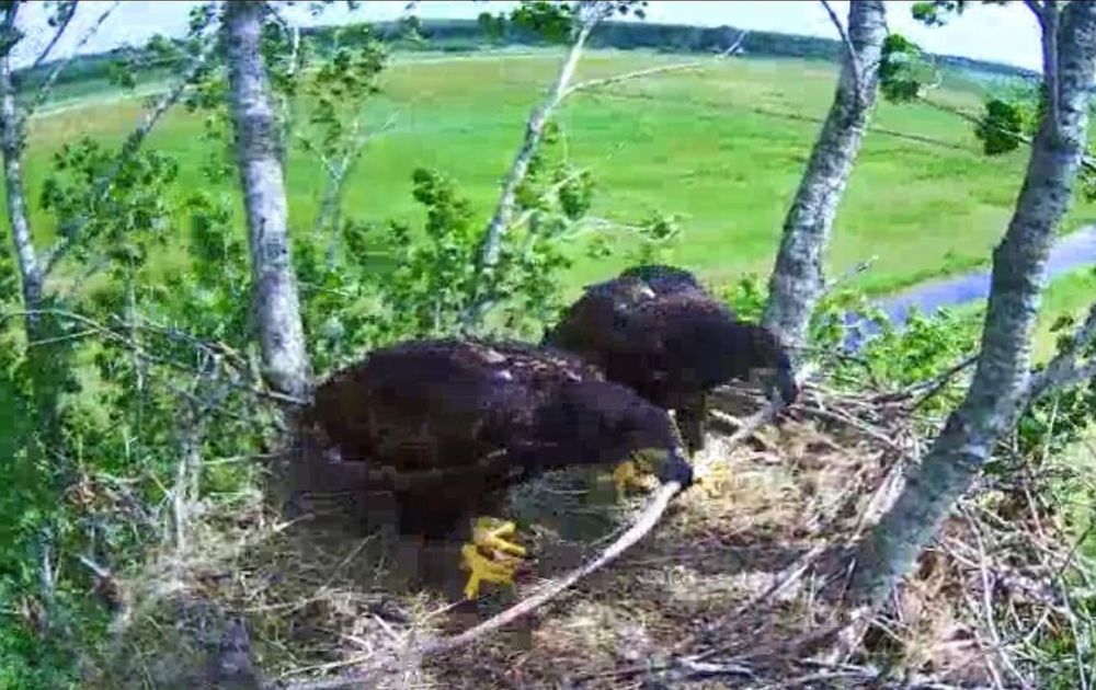 Het is me wel een stel, deze twee bengels in het hart van Friesland. Samen een beetje klooien met wat takken, en keihard piepen als een van je ouders met nestmateriaal in plaats van een nieuwe prooi komt.
