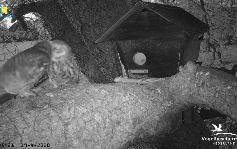 Vrouw steenuil krijgt van man een meikever aangegeven in de nestkast. Zij verwacht misschien dat er buiten meer te halen valt. Dan maar even niet broeden en ze krijgt dan buiten twee prooien van man.