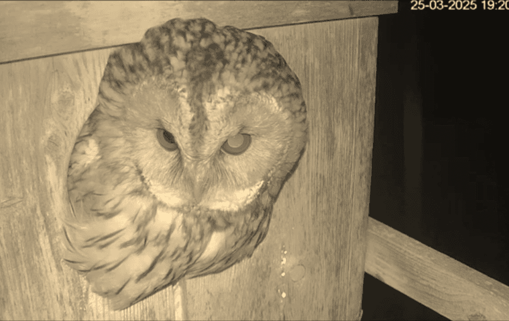 Geen prooioverdracht vannacht. Wel een paar keer beide uilen bij de kast. Vandaar 'Buitenbeelden 's nachts'.