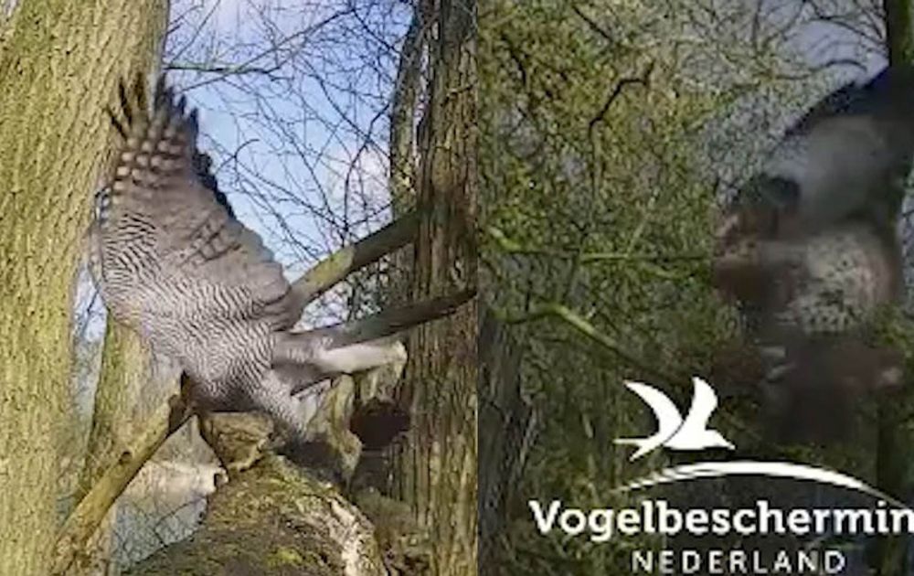 Vorige week viel de havik de buizerd die op het nest zat aan. Maar vandaag was het andersom. In de achtervolging grijpt de buizerd het havikmannetje vast. Op de grond weet de havik pas los te komen.