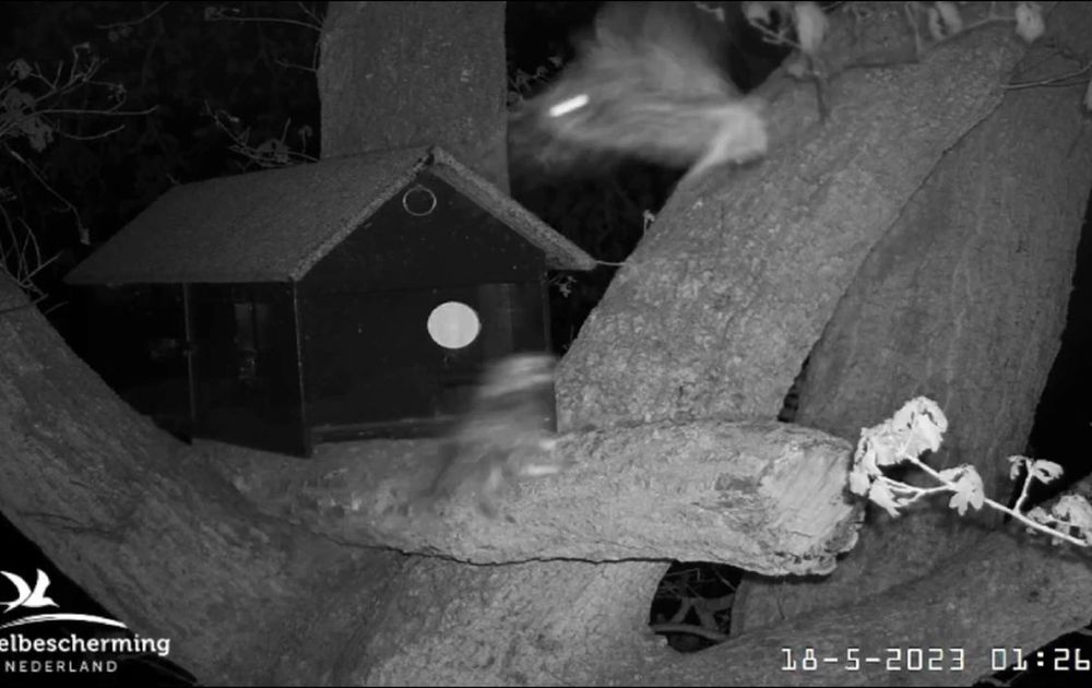 Een buuruil of een zwervende uil (floater) komt langs. Man steenuil ontmoet de vreemde uil.