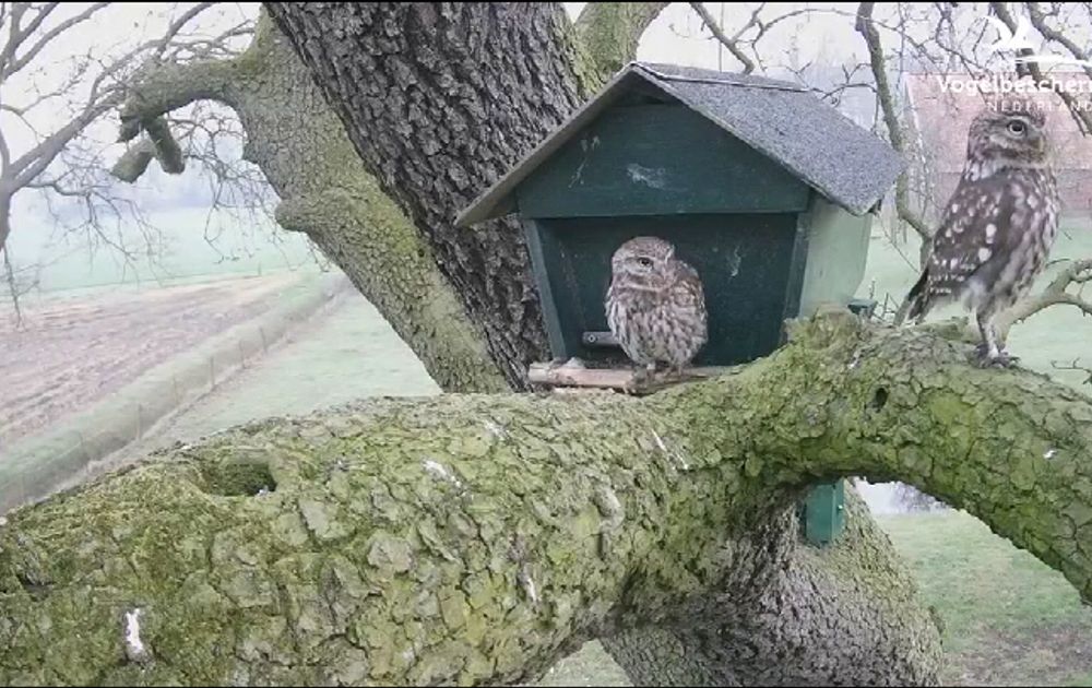 Vrouw steenuil links en man rechts zitten rustig bij de nestkast. Ineens roepen alletwee hard. Buur dichtbij?