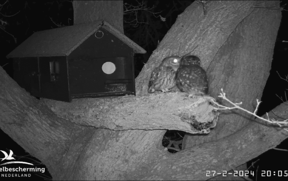 Man en vrouw steenuil maken (weer) een verkennende fase door. Vrouw maakt een iets donkerder indruk dan man. Zij heeft dikkere wenkbrauwen dan hij en een duidelijker tekening van de V op de nek/rug.