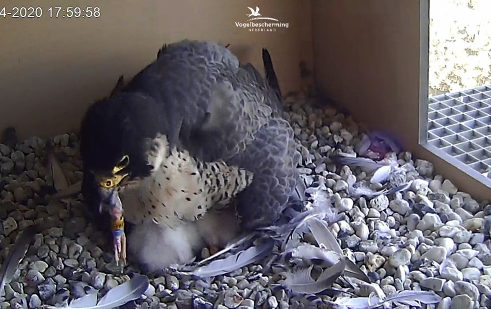 Bij het voeren van rond 17.00 uur blijft er een duivenpoot met ring over, die vrouw een uurtje later in zijn geheel doorslikt