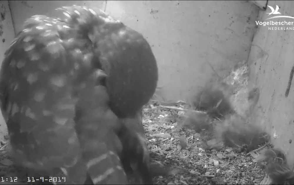 Op 11 september regent het veel en waait het hard. Overblijfselen van de orkaan Dorian. Vrouw steenuil is de hele dag te zien in de nestkast, van 6:59 uur – 20:00 uur.