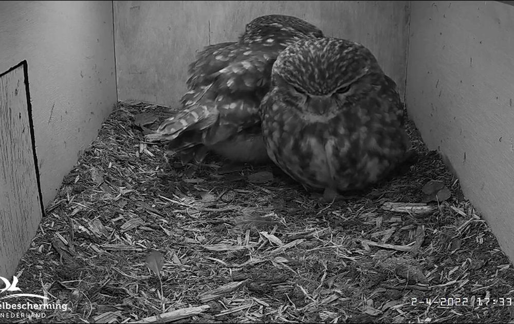 De steeuilen brengen samen lang in de nestkast door op 2 april. Slecht weer en/of ei op komst?