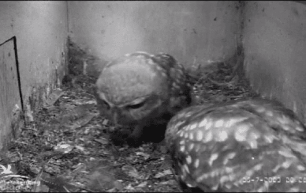 De jonge uiltjes waren op 25 juli weer veel in de nestkast. Soms is er eten en stoeien kan altijd.