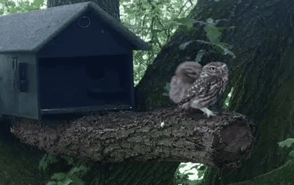 De steenuil man en vrouw waarschuwen de kuikens voor gevaren en zorgen ondertussen af en toe ook nog voor een hapje. De kuikens lijken nogal volgzaam.