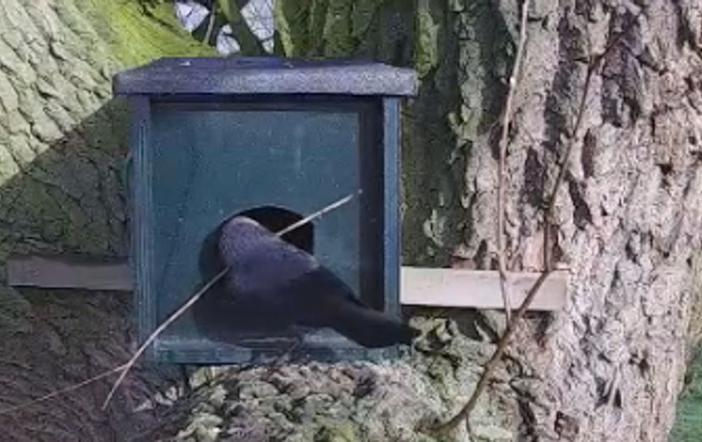 De kauwtjes zijn begonnen met het bouwen van een nest, grote en kleine takken moeten hoe dan ook naar binnen.
