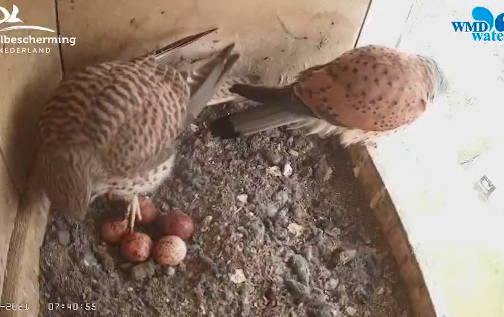 Nu er volop wordt gebroed is er niet altijd iets spannends te zien. In de ochtend komt de man twee keer met een prooi. Verder zit de vrouw de hele dag op de eitjes en strekt zo nu en dan even de vleugels. Meerdere keren per dag wordt het verenkleed verzorgt en zien we de vrouw een dutje doen.