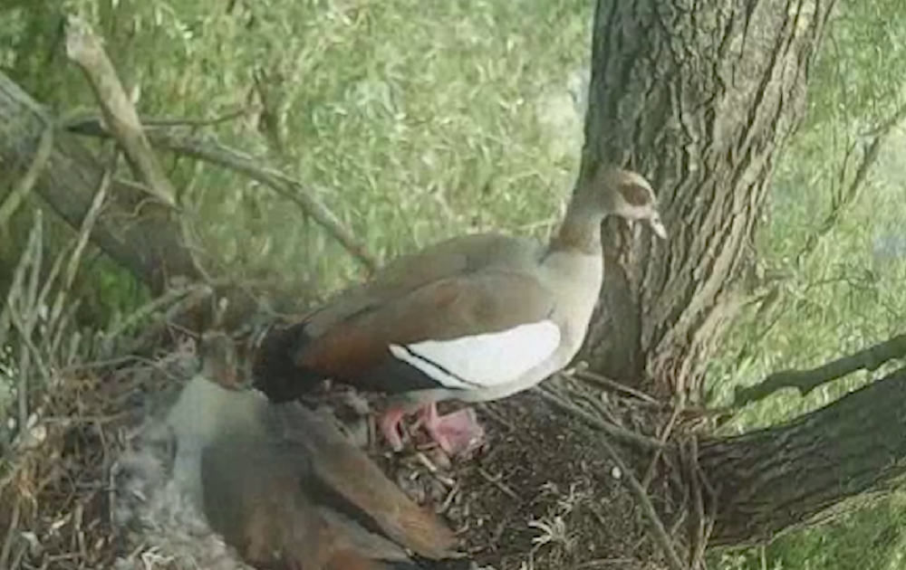 Een bekende gast, de eenpotige nijlgans, brengt een bezoek aan de broedende vrouw. Zou dit de man kunnen zijn? Zijn gedrag geeft twijfels bij deze theorie. Later op de dag vliegt ook de havik twee keer langs het nest.
