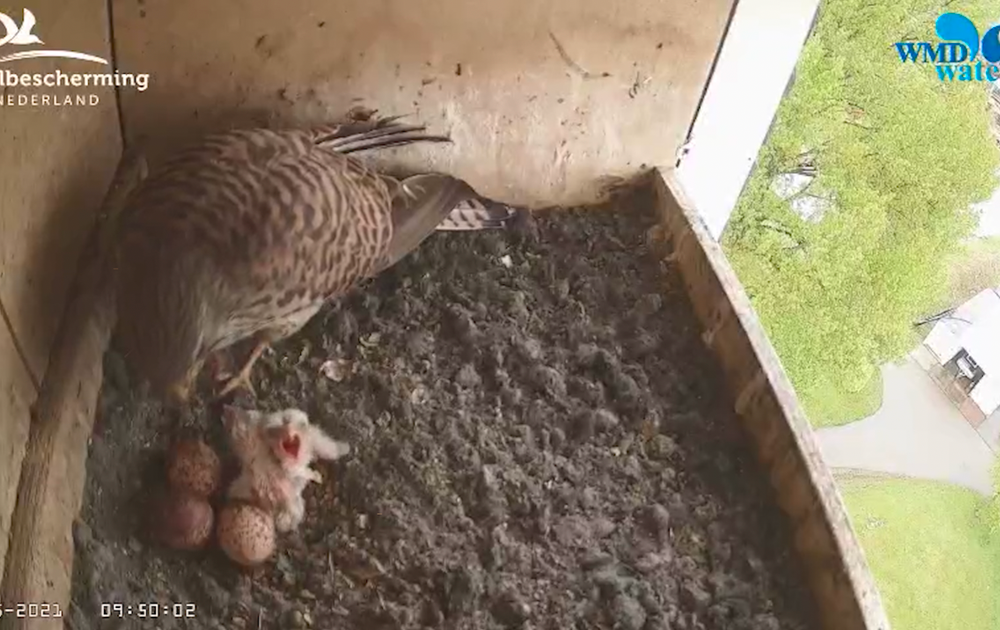 Vanochtend hebben de kuikens de eerste voedering gehad van vrouw torenvalk!