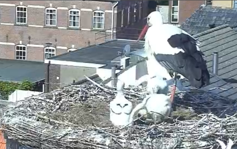 De kuuks groeien snel. Ze proberen al te gaan staan. Eerst staan ze op hun enkel (de knie van een ooievaar zit veel hoger, zelfs tussen de veren), maar twee van de kuuks laten hier al zien dat ze echt kunnen staan.