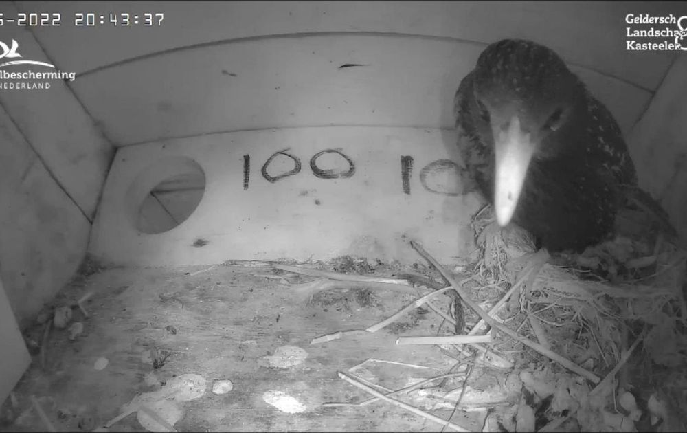 De enige bezoeker van kamer nr 100 (onze nestkast) tot nu toe is een spreeuw. Hij brengt ook weleens de nacht door, zoals hier van 4 op 5 mei.