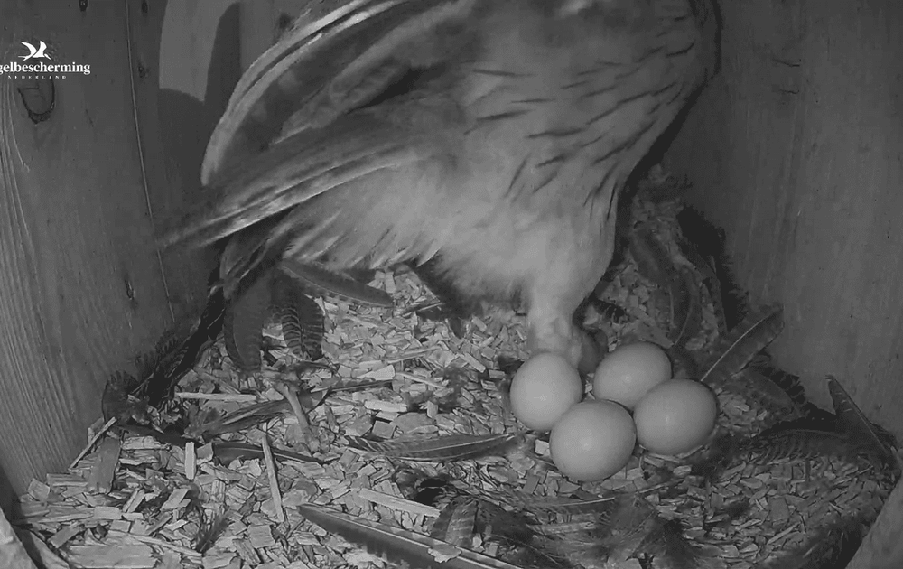 Claus, de eigenaar van onze bosuilenkast, dacht het al gezien te hebben. Gelegd: vanmorgen al om 6:16!