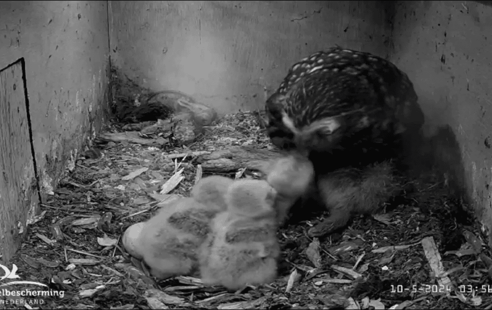 Vrouw steenuil bewaart de haasjes lang. Af en toe krijgen kuikens een grote maaltijd haas.