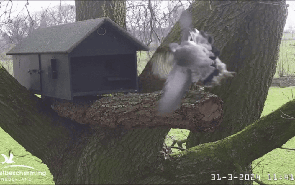 Terwijl vrouw steenuil nu meer in de kast verblijft om te broeden, gaat man midden overdag vaak naar buiten. Hij zorgt ervoor dat in de omgeving rondzwervende holenduiven en kauwtjes op afstand blijven.