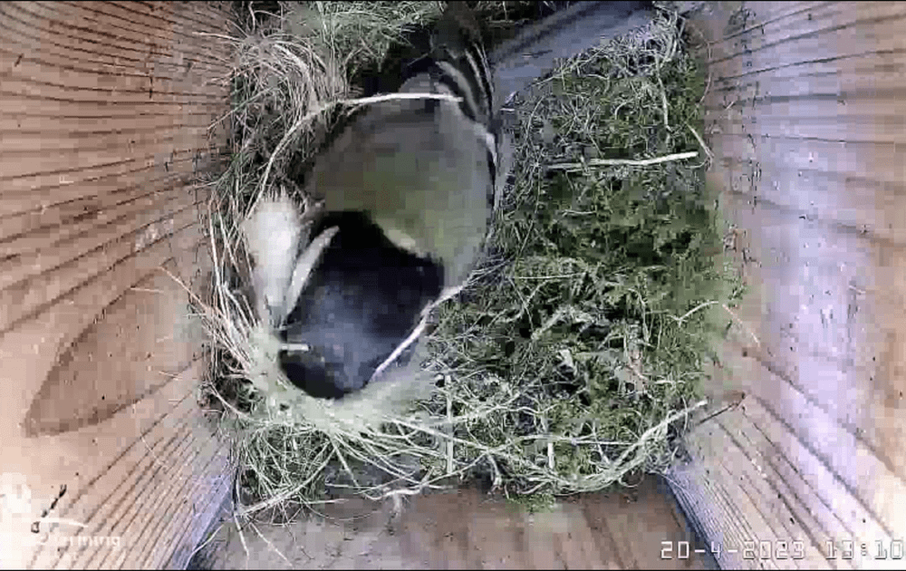 Al meer dan een week zijn onze koolmezen bezig met het bouwen van een nestje. Hoewel er al eieren liggen, vindt het vrouwtje dat er nog altijd iets bij kan.