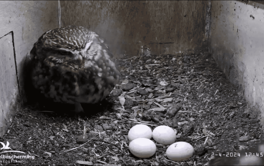 Vrouw steenuil legt het vierde ei op 2 april 2024 om 12:36 uur. Dat is 61 uur en 55 minuten na het derde ei, ruim 7 uur meer dan de gemiddelde tijdsduur tussen twee eieren.