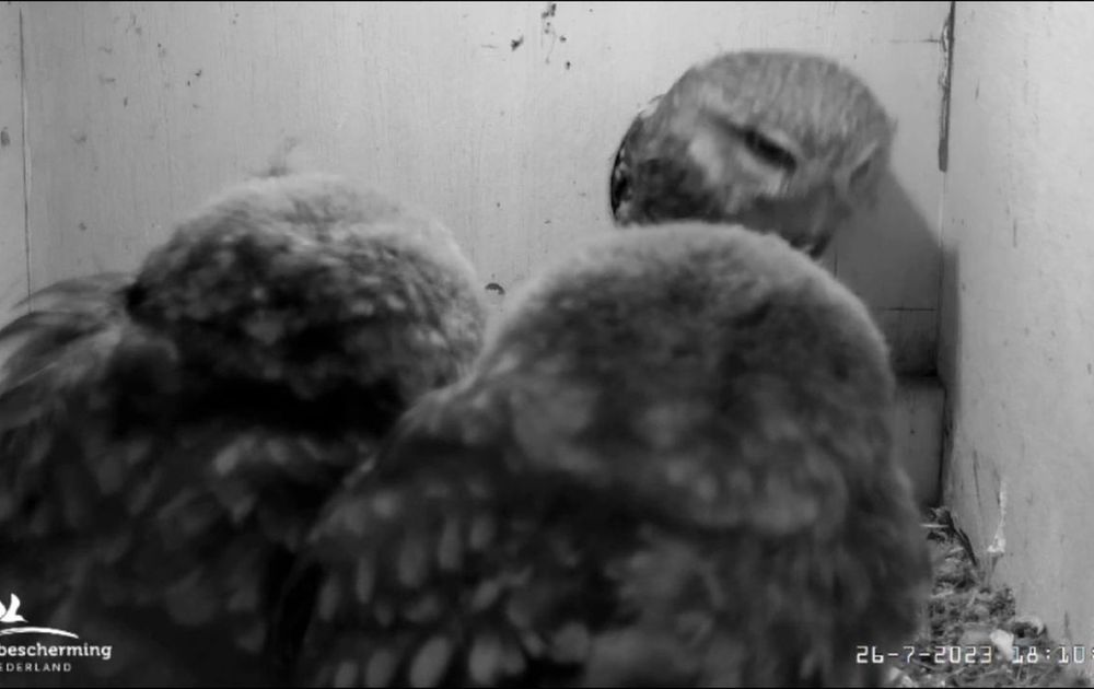 Drie jonge steenuilen zijn in de nestkast. Vrouw gaat maar eens kijken.