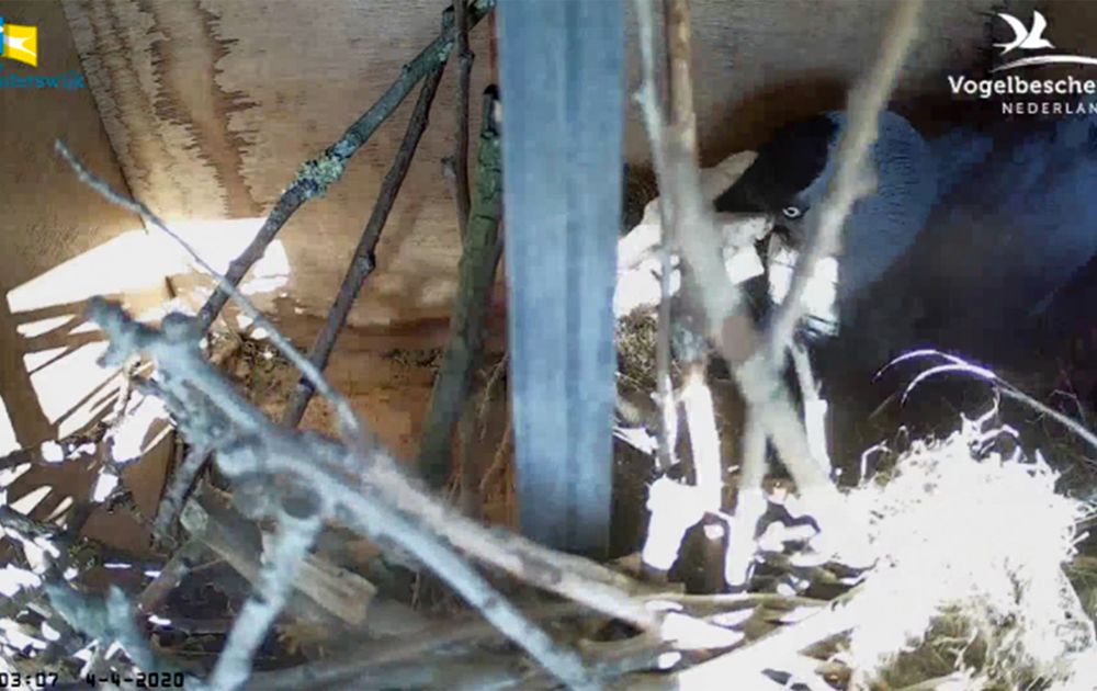 Takken, twijgjes, haar, stro, papiertjes; allerlei materiaal verzamelden de kauwen in de afgelopen dagen om hun nest te bouwen in de nestkast. Bij tijd en wijle wisten ze zelfs eventjes het zicht van de camera te blokkeren met al hun bouwmaterialen. Maar, het nest lijkt inmiddels zo goed als klaar. Nu is het wachten op het eerste ei!