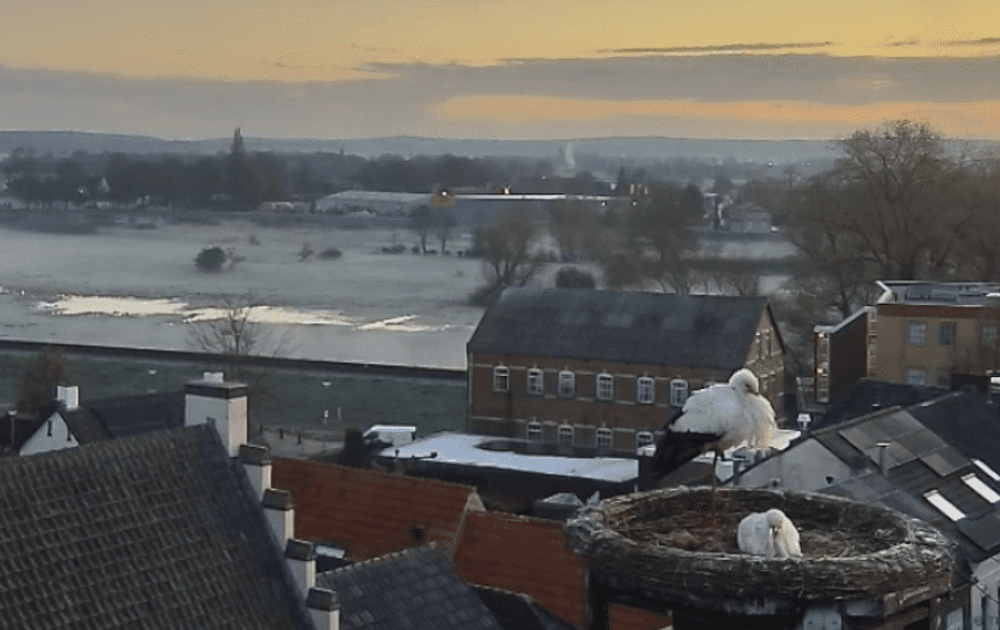 Het lijkt wel een winters tafereeltje, het zonnetje schijnt en  de mist trek over Gennep. Maar onze  ooievaars zitten op eieren. Gek eigenlijk.