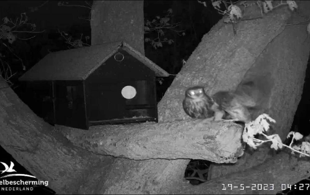Vrouw steenuil gaat vaker alvast naar buiten om de volgende prooi op te halen.