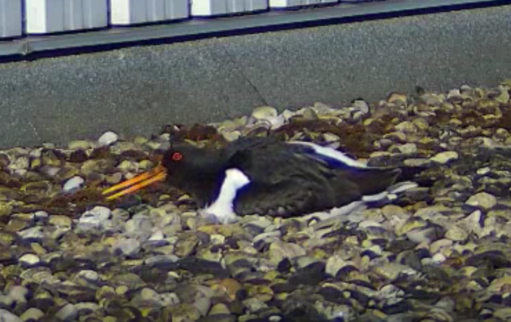 De scholeksters hebben nog weleens de neiging om ineens heel gespannen op het nest te gaan zitten. Dit betekent niet veel goeds! Gelukkig houdt deze extra alertheid de eieren wel veilig!