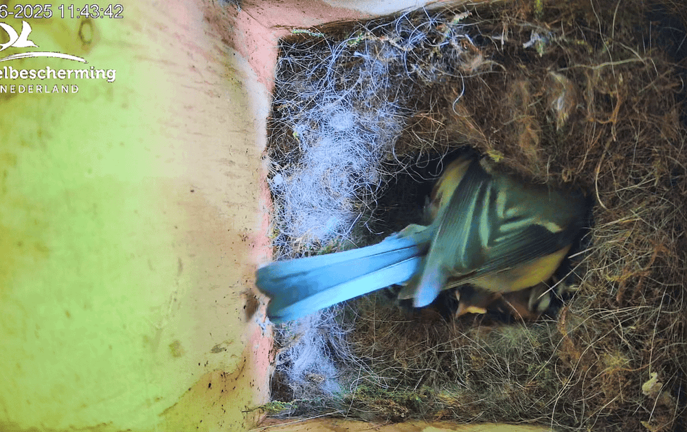 Vrouw koolmees blijft maar graven en graven in het nest. Waarom al dat duiken? Zoekt ze iets?