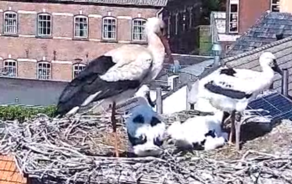 Afgelopen week zijn de kuikens minder in grootte gegroeid, maar de vleugels worden al langer en krijgen meer tekening. Ook blijven ze steeds langer staan. Vergelijk maar eens de lengte van Pa met een van de kuikens als ze naast elkaar staan.