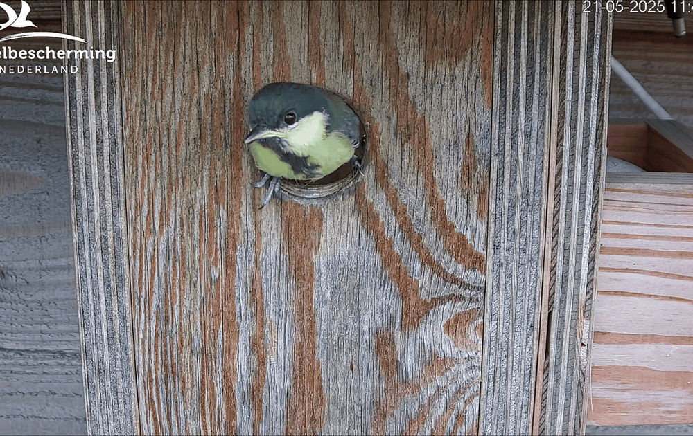 Terwijl we het uitvliegen van de koolmeeskuikens pas morgen verwachtten, heeft het anders gelopen en zijn de jongen vandaag een voor een vertrokken, de wijde wereld in. Het ga hen goed!