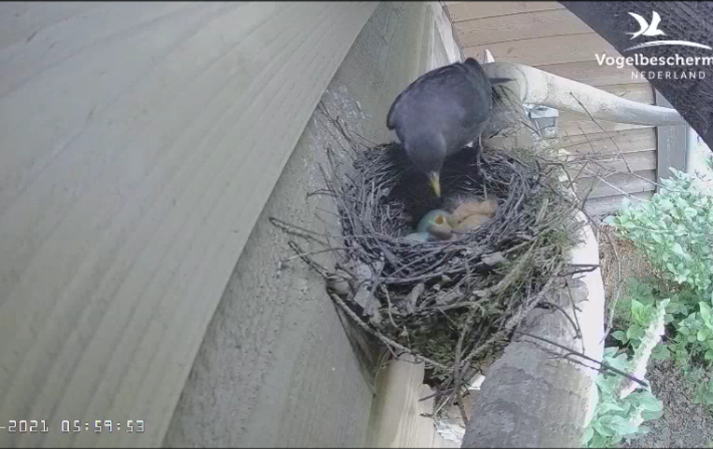 Al snel kwam vrouw merel voor de eerste voedering van de nieuwe boreling.