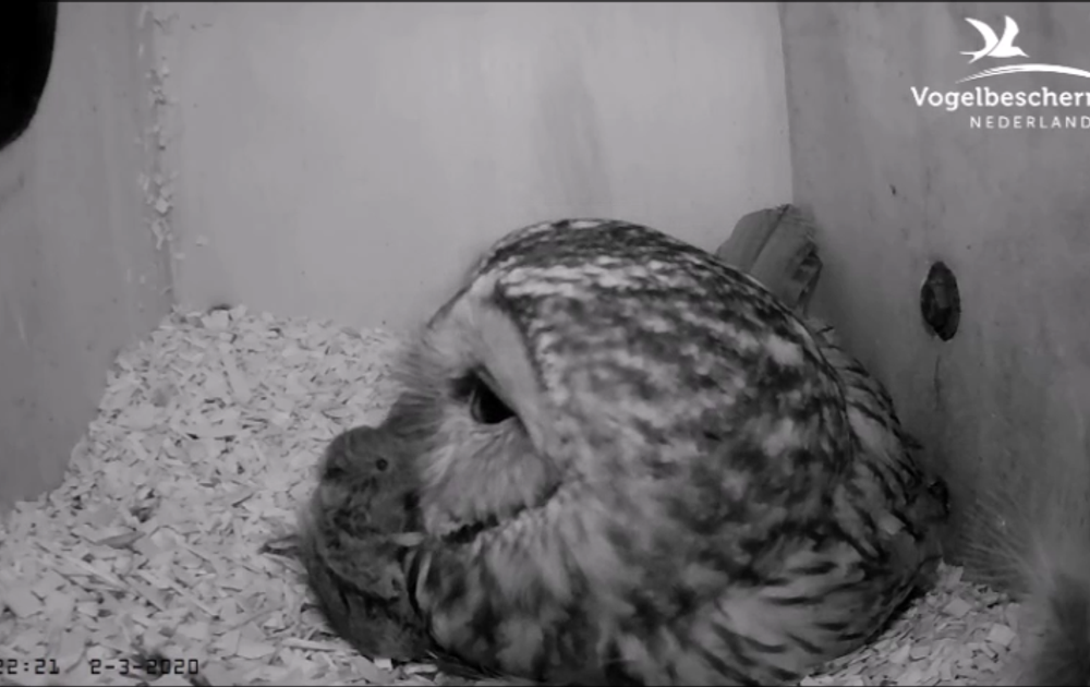 Een paar nachten werd er geen prooi naar de kast gebracht. Kwam dat door de sterke wind of de regen? Vannacht twee keer een prooioverdracht. Nu een dikke muis. Vrouw Bosuil lust er wel pap van