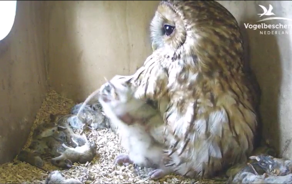 Al een paar keer heeft het kuiken de hele muis uitgespuugd: te groot nog. Dan haalt vrouw bosuil er een stuk af en voert het kuiken de rest. Dat lukt nu wel. Maar oh......die staart.