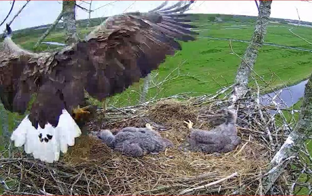 Vissen en grote en kleine vogels worden aan één stuk door vers aangevoerd op het zeearendnest. Je kunt de hele dag door eten daar, je zou er moe van worden...