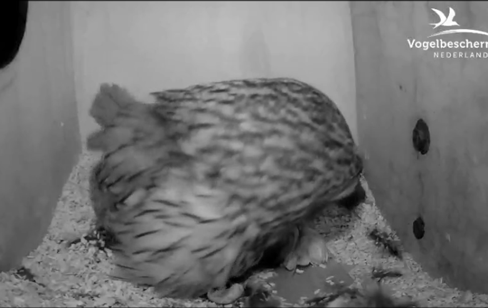 Eindelijk, het ei is uitgekomen. Ma bosuil pakt de eischaal en begint er aan te knabbelen. Opeens merkt ze dat het kuiken achter haar is terecht gekomen. Dat kunnen we gelukkig daardoor al zien zien.