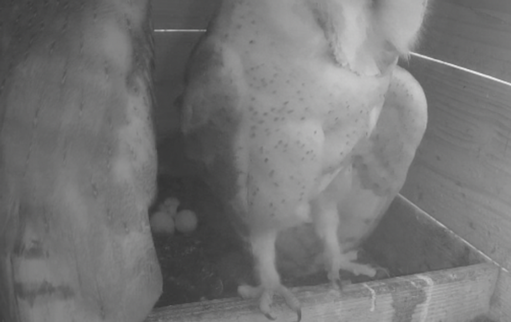 Vanmorgen is het derde ei gelegd! We weten niet precies wanneer, want man kerkuil zat (alweer) op zijn favoriete plekje, net voor de broedplek van vrouw kerkuil. Maar om 11.30 hebben we kunnen zien dat er 3 eieren liggen! Toen ze op de richel ging zitten, werd al haar aandacht getrokken door een bromvlieg. En die 3 eieren dan, zou je denken? Hup vrouw kerkuil, snel weer terug om verder te broeden!