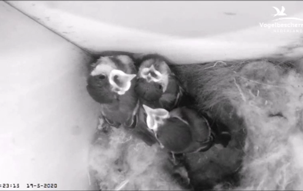 Helaas, ons dappere K4 is ook overleden. Nog 3 stoere meesjes over. Want stoer dat zijn ze. Ze krijgen al steeds meer praatjes, de meeste veren lijken al uit de pennen. Ze hebben nu een prachtig koolmeespakje, en durven steeds meer uit de nestkom te komen. Nog een dag of 5, dan zullen ze ons verlaten. Maar voorlopig nog even genieten van dit trio