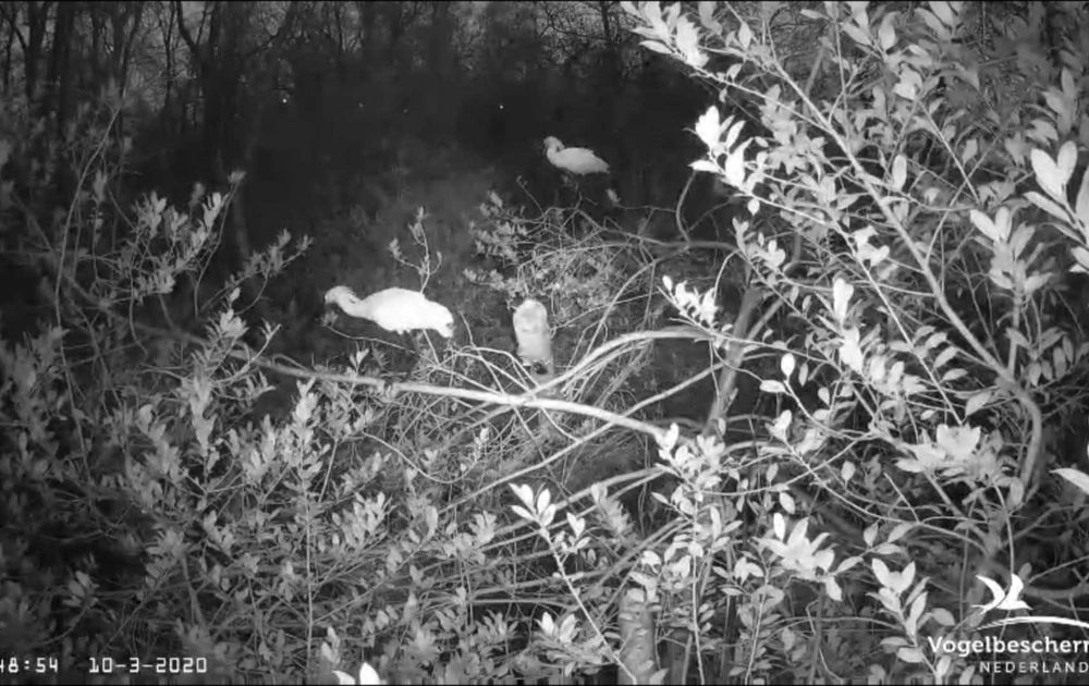 Op deze druilerige dinsdag arriveren de eerste Lepelaars rond 6.48 uur. Behalve elkaar een beetje pesten met het uitzoeken van een plekje (met als gevolg tuimelen in de struik) gebeurt er vandaag niet zoveel. Het lijken ook nog voornamelijk 'eenlingen' te zijn Van nestbouw is (nog) geen sprake, lekker de kop in de veren, tot ….