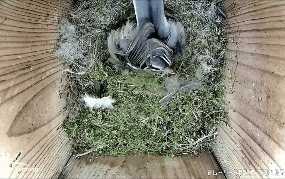 Vrouw koolmees is ongeveer halverwege het leggen van al haar eieren. Voor het slapen dacht ze het tijd om zo’n mooi legsel te voorzien van een mooi nestkommetje en de eieren te keren. En daarvoor moet je soms helemaal ondersteboven.